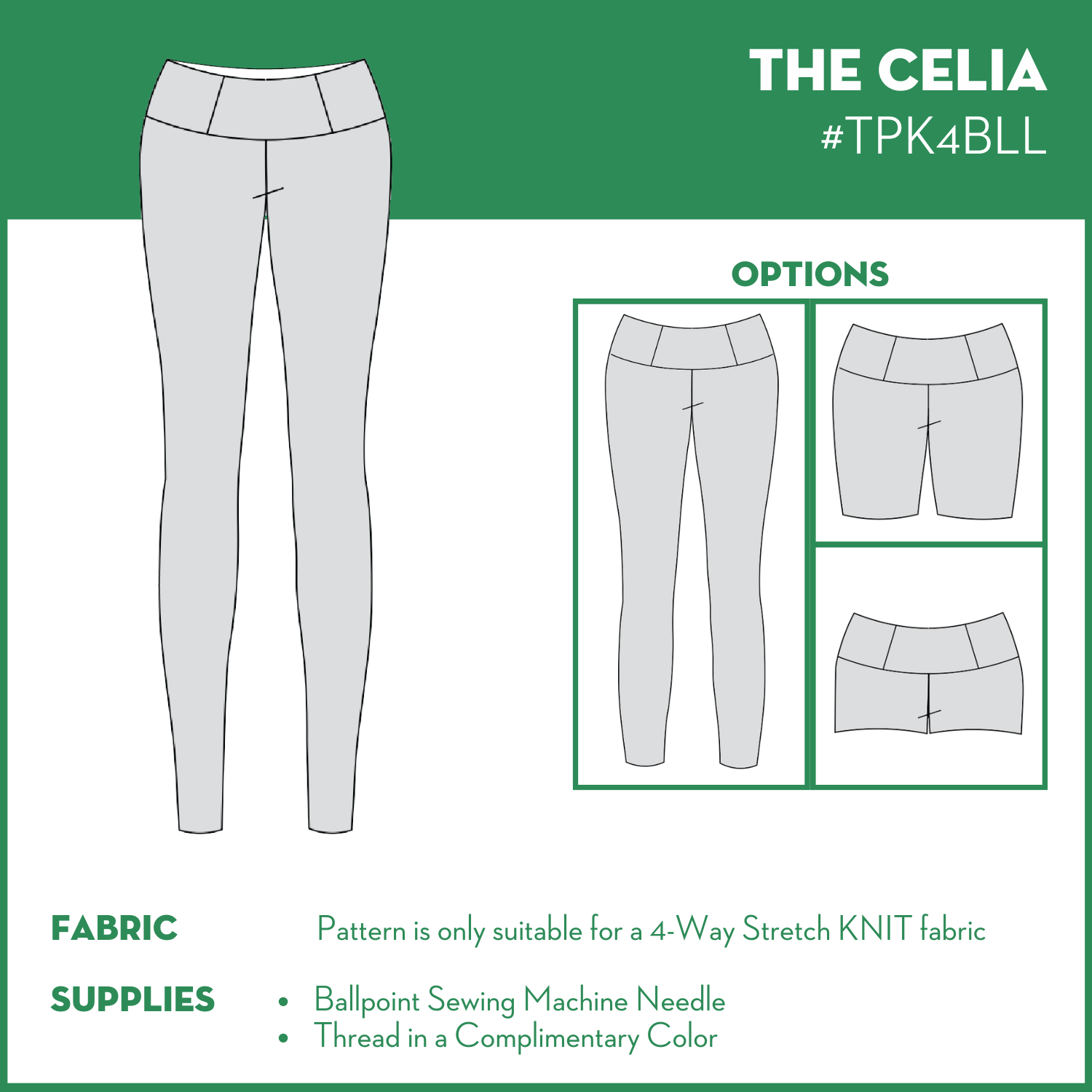 Leggings with a flattering wide waistband, the pattern has options for a capri length, bike length, or short shorts. This pattern is only suitable with a 4-way stretch fabric.