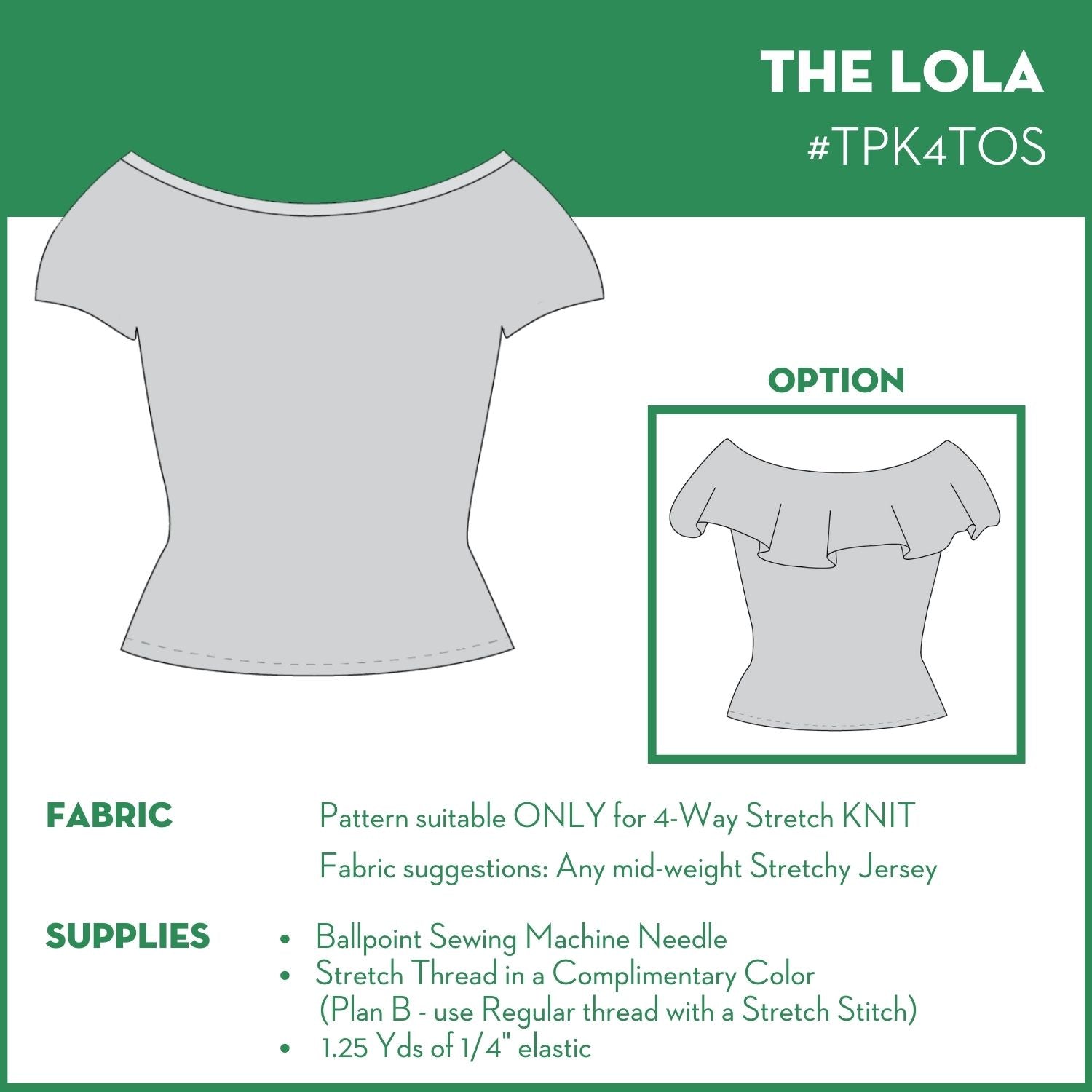 This fitting top can be made with or without a wide ruffle with a hem a few inches below the natural waist. If you want to line the ruffle, an additional ruffle needs to be cut (can be any 4-way stretch knit. This will add weight to the ruffle but the need for hemming of the ruffle will be eliminated. This pattern is only suitable for a 4-way stretch knit fabric.