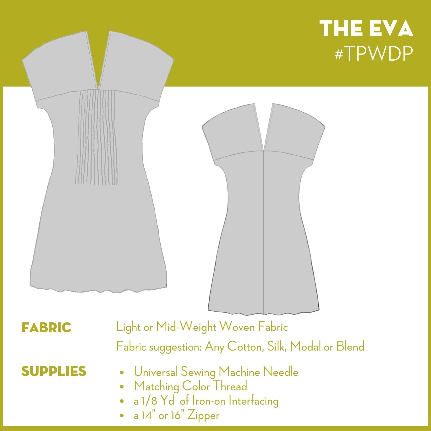 A dress with pin-tucks on the front panel, a shoulder yoke/sleeve and can be made more fitted with darts and a zipper but that is optional.